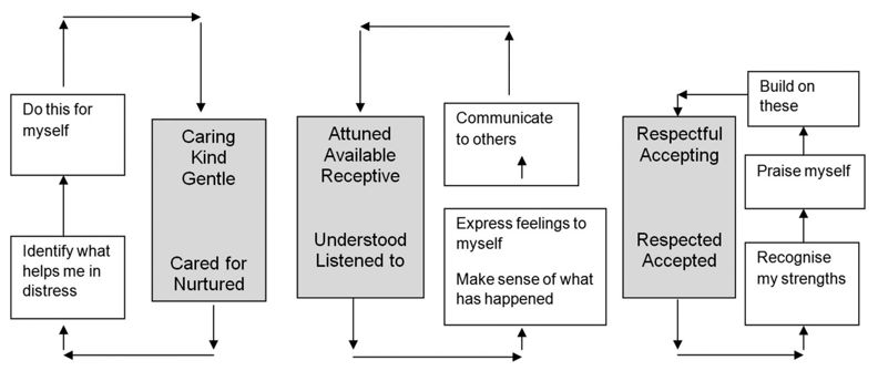 I feel a vital part of the work we do with our clients, particularly those with a personality disorder, is to offer and hold on to hope. Without hope there is hopelessness and despair. Along with understanding, validation, acceptance, containment, empathy and encouragement, hope is required as a prerequisite for change as it motivates, energises and drives us forward, making what can at times feel unachievable, feel achievable. Hope enables us to believe that things could be different. I feel it is possible and necessary to demonstrate this diagrammatically in the form of a ‘healthy’ SDR, or in CFT terms, activating the more compassionate emotional regulation system. I use the whiteboard to list the aims of therapy down the left hand side of the board. I then ask the client to think about how they would need to be able to relate to themselves in order to achieve these aims. Sometimes clients need help with this in the form of “I’m wondering if instead of being critical/blaming towards yourself, it would be kinder to be more encouraging/supportive of yourself just as you might do with your friends, since we have seen how your old patterns can leave you feeling in a very painful place”. I will then map this on the white board. I will move along mapping out other reciprocal roles such as:-