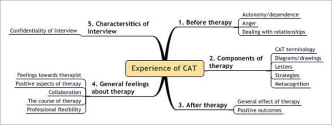 This study also provides preliminary evidence that learning-disabled clients who receive CAT view this form of therapy positively, feel that they are engaged in a collaborative process and incorporate the core components of CAT into their own conceptualisation of their problems. This conceptualisation and the resultant strategies gained are applied independently by clients after therapy has finished.