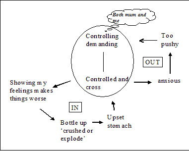 Very simple CAT diagrams highlighting one or two procedures can be the centre-piece of counselling lasting no more than four sessions. Mapping things out begins very quickly in session one. Here, in diagram 2, Rosa, an international student from South America and first year medic, came for the first of four sessions spread over the whole of her first year. It was just after Christmas and she was resolved to quit and go home. She was disappointed in university and felt very controlled by her mother who wanted her youngest child and only daughter to be at home. We put 'controlling to controlled' in a circle on a blank piece of paper and within minutes had linked in the 'bottling up' and 'getting an upset stomach' procedure which had prompted her visit to her GP who had referred her for counselling. She was very distraught and embattled with herself. Whilst in mental health terms her problems weren't severe the impact of dropping out of university and the loss of esteem would be considerable for her. The CAT diagram helped her overview the crisis. The diagram was an eye opener for her. Towards the end of session one a homework assignment was to see what happened if she spoke up for herself or was more assertive letting her feelings out rather than keeping them in. Two weeks later she reported she had got very cross with a boyfriend and we tentatively explored the parallel patterns of feeling controlled by others such as her mum and being controlling of others. Just over the horizon, but not yet easy to address, were patterns of eliciting control from others (her flat mates, her studies, or me, and/or her mother) and controlling and attacking herself. Rosa was ready to take an executive view of herself and monitor how she reacted to and interacted with others. The CAT diagram helped shaped her journey and offered a corrective tilt to the emotional compass giving her more room to tolerate her strong feelings. On CORE scores she was much improved and such improvement wouldn't have been achieved without the perspective taking and containing power of the CAT diagram and its higher level description. More significantly, eight months later she began her second year at university and at a brief follow up meeting reported a more 'give and take' relationship with her mother where she could see how she also could push her mother around.