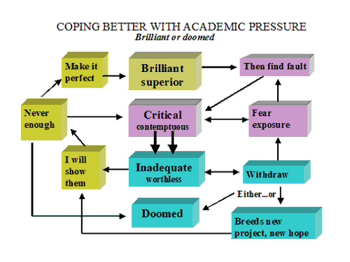 A typical combination of patterns as in the diagram below (which strikes a chord with many academics) shows a critical and contemptuous internal voice which, in CAT terms, produces a reciprocal role of feeling inadequate and hurt. The child's procedure for coping with this, which survives to the present, is a defiant one of "I will show them; I will get approval by showing them". But following the left hand side of the diagram it is never enough and attempt after attempt must be made to make it perfect or else the feared alternative of rejection, despair and doom is nigh. The dilemma is that "I will be brilliant and loved if perfect or a total failure and therefore unlovable". However the longed for feeling of brilliance and an admiring other is short lived because then some fault is found which provokes fear and self criticism. An alternative way of coping with critical pressure is shown on the bottom right hand side of the diagram; retreating into feeling doomed and giving up until the breeding of a fresh start or new project and again setting off on the path of "I will show them". Avoidance is always unsatisfactory because it brings with it a continuous fear of exposure and criticism about being in avoidance. Thinking procedurally in this and other ways offers many points of change and a greater sense of self recognition. As in good CAT practice, it lays out the routine for better spotting when interactions along these lines are enacted. It reduces self blame and cuts through some of the ways that we can draw other people into our problems. Benign versions of each of these procedures can easily be identified: striving can be rewarding and creative; exposure can be timely, considerate and constructive; avoidance can be restful and regenerative. Obtaining a perspective on one's self at work in this joined up relational way can help promote a more diplomatic, attuned and democratic executive self which can oversee striving, caring, resting and exposing in appropriate ways.
