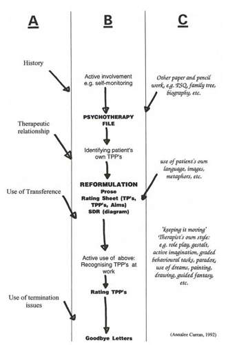 Column B is CAT-specific. Our introductory weekend is aimed at people who have no knowledge or experience of B; their knowledge and experience of A and C is very variable. As trainees embark on their first eight cases, we expect them to become competent at B. If they do not achieve this competence, they will not be accredited. We also expect them to achieve a certain level of understanding of A (the “ordinary psychodynamic” column).