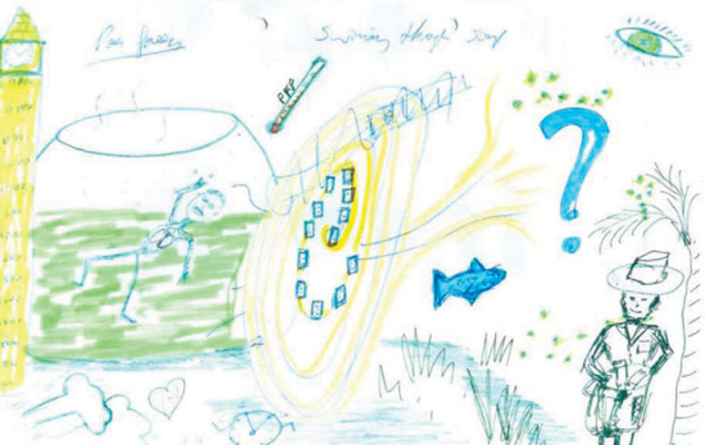 His picture (Figure 2) has a number of his problem procedures represented as emotional metaphors as well as his exits to these. He described feeling he was chasing time and swimming in soup, his anxiety culminating in a vortex in the middle with the dominos representing his catastrophic thinking. Through the vortex he is calmer and there are possibilities. In fact the fish is 'Dory' from the Disney movie 'Finding Nemo'. We had discussed in session that Dory was where he wanted to be, in her 'presentness' and seeming positive outlook. There seems to be so much in this, the winds of change (bottom left) but also change itself, leading him to see that there are other options and preferred positions rather than his habitual reciprocal role procedures.