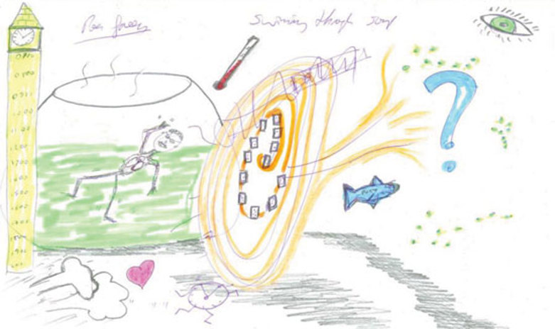 ‘As I progressed through the therapy process I identified some images that described my overcoming of this initial ‘swimming through’ and these were depicted by Jim and positioned at the ‘other end of the vortex’. The image of the fish, for example, came from the idea of a fish that is able to keep on swimming, regardless of difficulties it encounters. The image of an explorer emerged towards the end of the sessions in an answer to a question from Jim as to how I now perceived myself, having gone through the process of therapy; in this case I perceived myself as being ready to venture into the potentially exciting realm of the unknown, complete with a ‘toolkit’ that I could use in order to examine and help any psychological problems that I found flaring up in myself.'