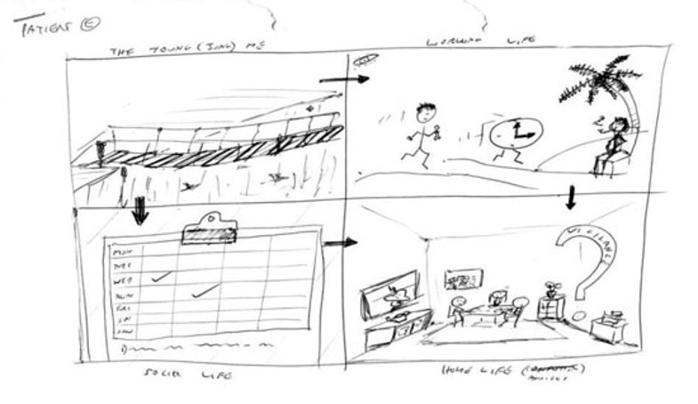 ‘The diagram ‘Swimming Through Soup’ came about in the initial stages of my therapy, working in conjunction with Jim to try and depict the state of my feelings and my perception of how I was interacting with the world when I began therapy. Jim drew some of the elements that we agreed were strongest images that I used and then added various elements throughout the sessions as we progressed. The central image, for example, came from a description that I used of struggling through anxiety and depression as being like ‘swimming through thick soup’. The other key element of a vortex came about when I described feeling as if I was getting sucked into a hole and flung out into a terrifying, isolated place. Added to this were illustrations of anxiety related aspects from my daily life such as the perception that ‘time was running away’ and a thermometer, based on my feeling physically overheated in situations of perceived anxiety and stress.