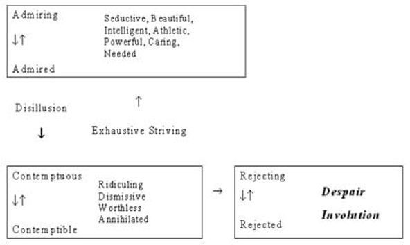 Fig 2 demonstrates a CAT understanding of later life narcissism: ageing brings with it considerable assaults on the grandiose (admiring to admired) self in those with a narcissistic personality structure. 'Narcissistic' collapse occurs when exhaustive striving is no longer able to generate even brief moments of reciprocated admiration, leading to despair and the experience of potential annihilation of the self. The only safe place to go is further into the shell of 'involution' - rejecting the outside world and attempts at dialogue. It is here that some people retreat into a pseudo-dementia (as did Lear himself) as the final acting out of the humiliated, contemptible self. This sort of developmental understanding allows description of the reciprocal role play at work which gives a framework for the understanding of the client to therapist relationship in such clinical work, which in turn gives hope of non-collusive interaction and therapeutic change. As Winnicott recognised: