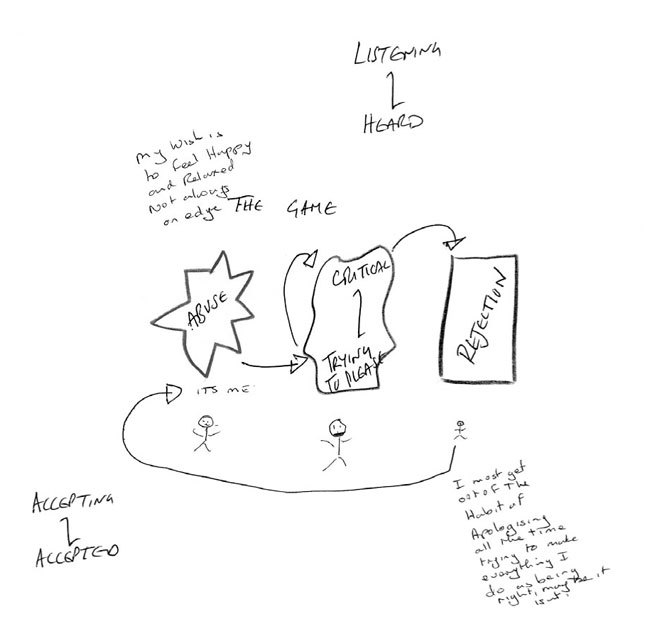 This is a very moving letter as it addresses me at the same time as the step-brother, with a grateful (and admiring) sideways glance. ‘But then only sometimes’, I think, refers to the therapy. The therapy progressed well with Maureen, very pragmatically making assertive changes i n her life with her current partner and her family. She experimented with expressing her ‘bottom role’ feelings to them and realising that embarking on ‘the blame game’ only ended in rejection and desolation. I include here Maureen’s simplified map (or Sequential Diagrammatic Reformulation - SDR - in CAT jargon). The feeling left by the abuse, ‘it must be me’, caused a striving, perfectionistic compensation that left Maureen feeling taken advantage of and critical of those close to her which resulted in rejection and a return to the crushed, guilty child.