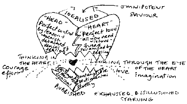 Neither image is related to robust real feeling, to the heart previously described as central, and the heart we need to be unifying in this greater sense is devalued, encouraging rational, quantifiable, reasoning forms of thinking to move into the ascendancy, to take control. And perhaps such polarisation encourages the head/heart split, which might, on a diagram look something like this: