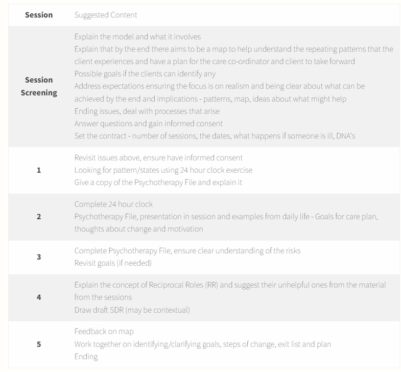 The approach depends on having an empathic alliance with the care co-ordinator (as well as the client) and working with the client’s risks, developing goals, agreed ways of working, plans for change and a contract with the service, including planned endings. The consultant typically works with the client and care co-ordinator together for five sessions, including time alone with the worker before and after sessions with the client, to enable them to work well using the agreed approaches. This additional time with the worker allows space for them to express their struggles, reactions and difficulties working with the client, to help them understand the process that they are part of and become involved in developing the reformulation. The benefits from experiential learning, teaching, and reflection with the worker include helping them to understand their own reactions to the client, try different ways of responding to the service user, helping them understand how to work with recognition and revision of the client’s unhelpful patterns and how to manage the case in a way that is intended to ‘do no harm’. The aim is for this experience to be empowering, supportive and containing for the care co-ordinator. Following on from these sessions, additional support or supervision is provided if appropriate and at the care co-ordinator’s request.