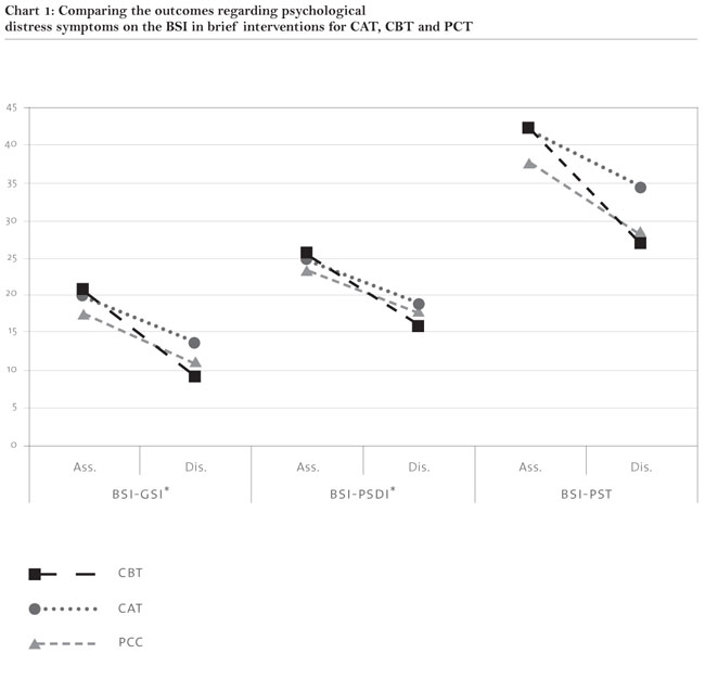In terms of outcomes achieved, there was some suggestion that a longer CAT intervention improved outcome. This was seen in better mean improvement scores for the medium-term intervention, as well as more clients achieving a clinically reliable improvement. Whilst few of these differences were statistically significant, this comparative effectiveness of a longer intervention was clearer in the CAT service than the other two services. CAT appeared effective in terms of creating an improvement in psychological and interpersonal distress, and that it is comparable with other psychotherapies practised as standard in the NHS. There was a statistically significant trend however showing brief interventions of CBT to improve general psychological symptomatology at greater rates than does CAT, which is demonstrated in Chart 1. Within longer interventions, CBT and CAT were more similar across all measures used, and achieve slightly superior improvements in depression and interpersonal difficulties than PCT.