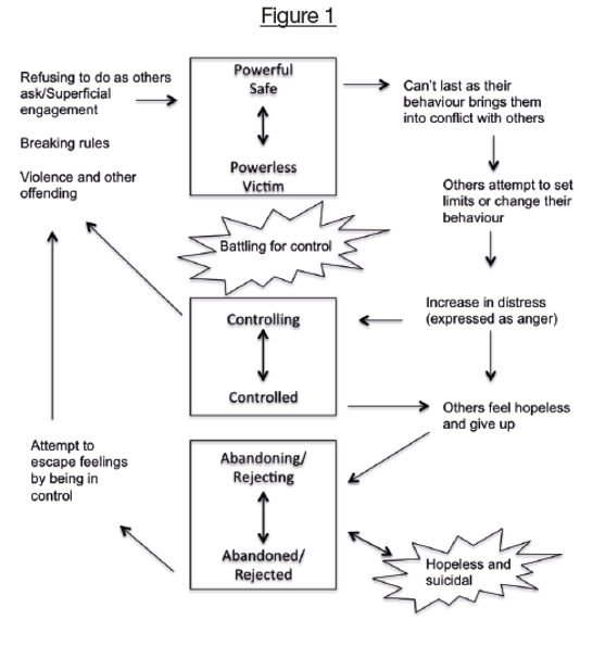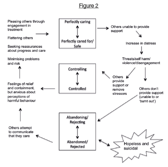 However, what then develops are repetitive cycles of battling for control between service users and staff members/services. This can lead to high levels of frustration and hopelessness in the staff team, leading them to ‘give up’ and reject/abandon the service user in the form of moving them to a different ward, hospital or a higher level of security. For service users this abandoning/rejecting response of others can connect them to painful feelings of being rejected and blamed. Such feelings are often rarely accessed because they are associated with vulnerability. Service users are therefore at a greater risk of self-harm and suicide at these times due to the connection to these painful feelings. Rather than be in touch with these feelings service users may try to feel in control again in whichever way possible, for example by making threats to others or by refusing medication, thus continuing the battle for control.