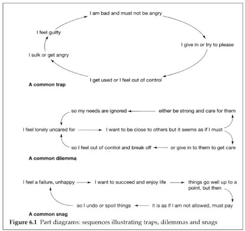 CAT initially involved verbal descriptions of dysfunctional, seemingly non-revisable, patterns. Traps, Dilemmas and Snags are more complex descriptions than those of conflicts, irrational beliefs or non-functional behaviours. They include the context and events, knowledge, beliefs and values, acts and consequences, including the responses of others. The advantages are that they are sequential and draw attention to antecedents and consequences.