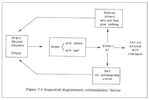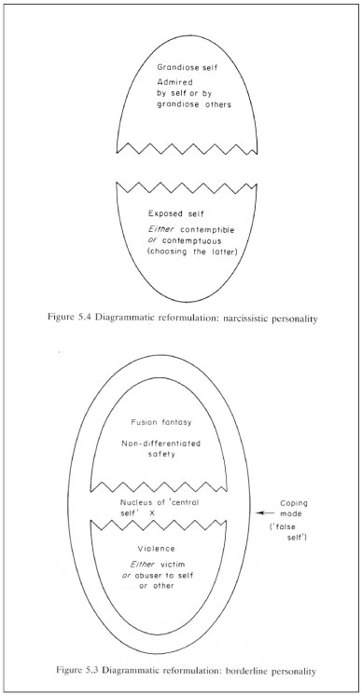 Increasing experience with patients with Borderline Personality Disorder presented difficulties to therapists trying to devise diagrams. This was resolved by the recognition that such patients operate discontinuously. Diagrams were drawn with separate cores, initially most often the ‘Broken Egg’ diagram (Map 4 and Map 5, Ryle 1990, Pg 106-107), which alerted therapists to recognise separate alternating self-systems (that which you have no model of, you do not easily see). Procedural loops could be left out for simplicity.