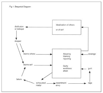 It is important to be clear about the distinction between the concepts of states and self-states. A state is a subjective experience; a mood with associated memories, ways of acting and relating etc., such states are always associated with a role, played in relation to another, or to an internalised other. A self-state is an abstraction, our understanding of the structure in Borderline Personality. BPD diagrams describe the RRPs of the different self-states. They are not schemas located in the head, generating procedures. They are our generalisations derived from detailed observations and reports of what the person goes on feeling and doing in relation to others and to the self.