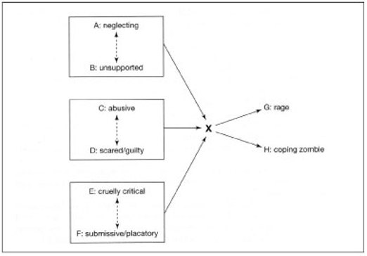 BDP is seen to involve partial dissociation between alternative RRPs. These original, usually Abusing – Abused RRPs, may be re-enacted, but often, faced with evident repetitions, dissociations to alternative, less forbidden patterns may occur (e.g. zombie states, compliant, soldiering on states etc.)