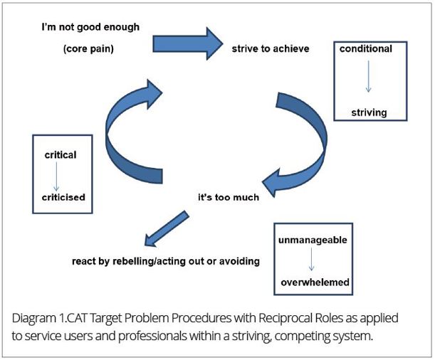 Where service users enact a cutting off procedure, I can feel that I need to try harder, where their response to my intervention is to become passive or withdraw. A transference (referred to in CAT terminology as ‘the dance’ or enactment) can also occur, where the service user’s feelings of pointlessness can be ‘projected’ onto me, and I can then feel that my interventions are pointless, and become despondent, in turn feeling defeated or dismissed. With the external demands of the system I work in – meeting targets, increasing caseloads and so on – also feeling over-controlling, I can then, like the service user met with controlling circumstances of their own, choose to zone out and isolate myself.