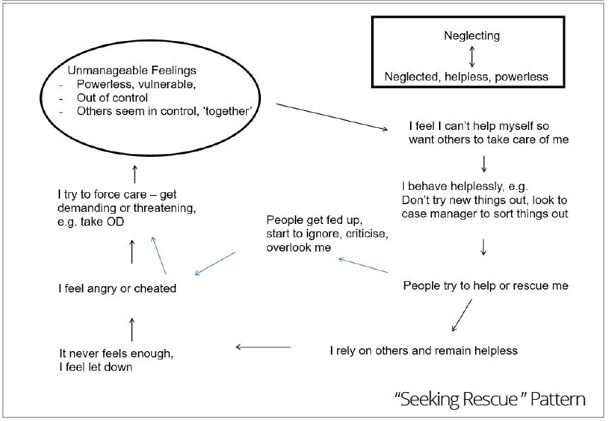 Likewise, with a service user that seeks to be rescued, I can reciprocate and become ‘the rescuer’, reinforcing their helpless role, which does not empower them, but will likely cause me to become frustrated and resentful of their over-reliance on me, not to mention my feeling exhausted. I could also feel that I have failed when the service user becomes disappointed and unsatisfied that the ideal caring role they are unrealistically seeking cannot be sustained. If, however, I am able to create a dialogue around the subject of the service user’s natural sense of disappointment when the fantasy or compensatory elements of their map proves inconsistent with reality, then a more authentic relationship has a chance to develop.