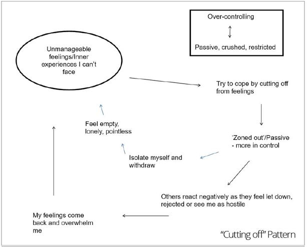 We used three diagrams to chart out the patterns or target problem procedures (TPPs) that service users can enact with us and others, using three self-states: cutting off, seeking rescue and bullying (see Appendix 1). As you can see in the diagrams, the reciprocal roles (RRs) we labelled were: controlling-to-passive or crushed (cutting off), neglecting-to-neglected (seeking rescue), and abusive and powerful-to-abused, powerless or threatened (bullying).