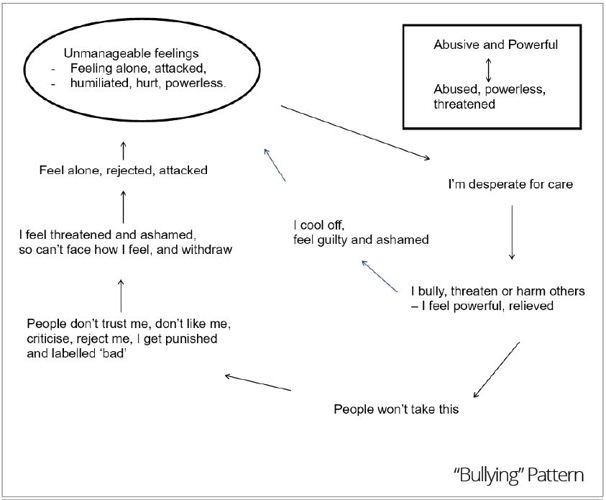 Finally, with the bullying state in mind, the behaviours of service users that can be critical, rejecting or threatening of services can be reciprocated - mirrored back to them unconsciously where professionals can react in similar, if understandable, rejecting ways. To talk with the service user about the underlying and difficult or unbearable feelings that underlie and maintain their rejecting behaviour, such as vulnerability, loneliness and powerlessness, can lead to understanding and a way to find exits, such as changes to their ways of relating and thereby avoidance of future rejecting or similarly negative enactments.