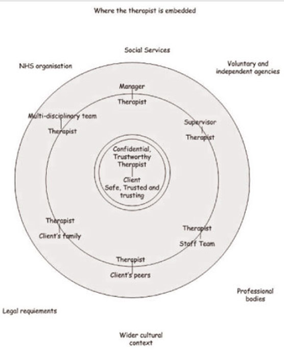 We wish therapy to be safe and contained. There is a fantasy that it is possible to conduct therapy totally removed and separated from the world, as a complete unit ‘entire unto itself’, with no breach of confidentiality. It would feel easier to be able to stay in a safe, confidential place. This is an ideal therapeutic environment, but we have the dilemma of the demands of the wider system and our main dilemma is around our accountability to this wider system. For example, some of us have had our process notes (which, in the NHS, are the property of the Secretary of State for Health, not ours) subpoenaed by the Court.