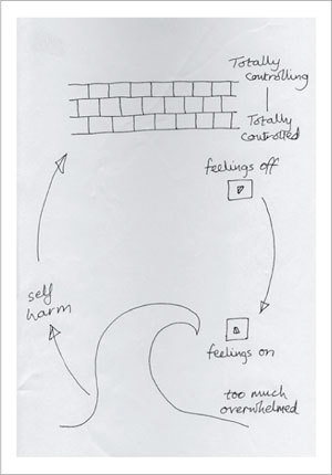 Adam was a fifteen year old who was suffering from depression and had been self harming. He had been sent home from boarding school because they could not cope with him there. His relationship with his parents sounded reasonable, they had split up when he was nine years old and he had lived with his mother, to whom he was closer. He described his father as a bit controlling, a perfectionist. He had been badly bullied at boarding school but had never told either parent. On returning home, he had had a few sessions of cognitive behaviour therapy but did not like it and dropped out so CAT was suggested. He was tall and slim and dressed as a Goth, all in black and with black eye makeup. He said that he had wanted to dress that way for a while but had only recently had the courage to do so. He had also recently come out as gay and started a relationship with a boyfriend. He didn’t know why he wanted to dress like a Goth – it just appealed to him. Putting other people off wasn’t a problem as the people that got to know him would be the ones who had really made the effort. He showed very little non-verbal communication and was strange to interact with. He said that he put a lot of effort into reading other’s body language to predict what they were thinking, but he made sure that he did not show any feelings and did not give anything away. In the waiting area, before the first session, he was drawing in a sketch book. I showed an interest in looking at his art, wondering what the drawings might reveal, but he proudly told me that the drawings would look identical whatever mood he was in. He described putting up a dam so that others couldn’t see his feelings and I drew a wall at the top of the diagram (see SDR). This felt safer for him, as he was in control, but was strange for others. We came to see that he was also using the dam to block out any difficult feelings and this meant that he was switching off feelings and was out of touch with them. He did not see this as a problem as he thought that his feelings were irrelevant and that others would not be interested in them, they would just be a nuisance. The problem was that sometimes feelings broke through the dam and they were like a tidal wave. That was when he self harmed – somehow that got the dam back in place. We added the tidal wave and, later the feelings switch which was either off (at the top of the diagram) or on (at the bottom). We talked at length about the pros and cons of this and whether it might be better to have a “feelingsometer” rather than merely a switch. That way he might know then what he was feeling more of the time and detect it earlier when feelings were building up. Having never let his feelings through, he had not learned how to cope with them in healthier ways, he wasn’t getting any practice. Thus the middle ground might be “being more aware of feelings, learning to comfort myself, risking expressing them sometimes”. Adam did not like my description of this middle ground as being a better parent to himself, but he could see that this might be a better place to be than the two extremes which he ended up in. He decided, at first, to experiment with letting others see how he felt by allowing some non-verbal body language to show. He discovered that people around him started to ask what was wrong and gave him the opportunity to talk about things before they got to the tidal wave stage. He started to see that expressing feelings was sometimes useful and gradually stopped feeling the need to self harm. Other work led to him feeling better about himself but the key change seemed to be the “feelingsometer”.