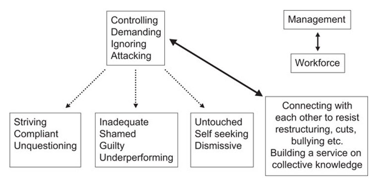All too often the reactions to commands from above range from conscious agreement to unthinking compliance (“this is how the world is, get on with it”). This merges into resigned acceptance or silent protest of something experienced as disturbing. It is very easy to experience the instructions as just that and to feel impotent. NHS management increasingly promotes a sense that dialogue and discussion present unnecessary delays; managers become focused on ensuring that the directives they are carrying out are complied with by those beneath them. Genuine discussion amongst adults about complex issues is dismissed as time wasting. Generally the views of the workforce are seen as irrelevant; although at times changes are given the gloss of ‘consultations’ (see also Jones & Childs (2007)), the majority of these are meaningless exercises though at least they can slow the process down. Becoming assertive in the face of this is not an easy process for the workforce and probably more so for those who work psychotherapeutically as the nature of the work requires listening to the views of others and responding sensitively in a way that aims to help the patient to think about themselves. In contrast, responding to managers requires a very different mental state of assertion not accommodation, expressing an independent viewpoint rather than seeking to reach a shared conclusion as there is a fundamental divide between the participants in this debate. At a minimum, for those working psychotherapeutically to help patients make fundamental changes in their lives, discovering how our own micro level reciprocal roles interfere with our capacity to speak as adults to those in authority over us can at least build our understanding of why it can be so difficult for patients to make real shifts.