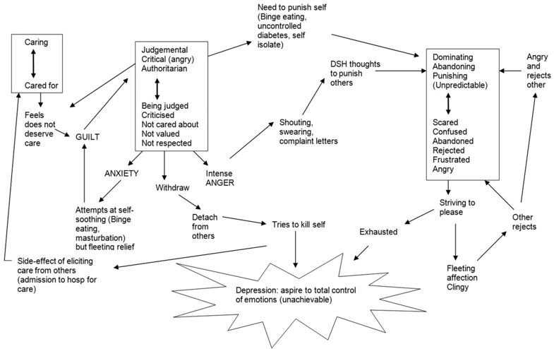 43 year old woman referred for CAT by the community mental health team who had been involved in her care for over 10 years. She has a long history of borderline personality disorder, characterised in her case by frequent self-harming behaviours, binge eating, and occasional frank attempts at suicide. Alongside this, she has had recurrent severe depressive episodes and an ambivalent relationship with services, as she has frequently complained about individual members of staff and services as a whole.