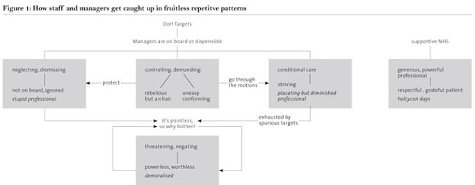 They may feel that if they are not ‘on board’ with changes, they can be replaced by someone who is. This can result in controlling and demanding behaviour and communication with clinicians through hasty and sham consultation processes implemented in often clumsy and insensitive ways. We have described how clinicians can either attempt to buckle under and conform to demands (Placating but diminished professional), or, try to protect the values they believe to be important, ending up ignored and seen as archaic (‘stupid’ professional). Both these states lead into a position where management becomes increasingly threatening and negating of professionals, resulting in feelings of powerlessness and worthlessness in the professionals. The placating professional becomes burdened by spurious targets, sheer volume of work, and an overwhelming sense of futility; the ‘stupid’ professional experiences a sense of exclusion from the organisation. We have represented earlier experiences of working in the NHS as a split off, idealised state in which patients were grateful and respectful to the generous and powerful professional (Halcyon Days).