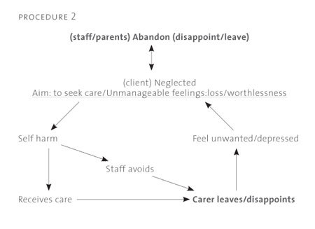 The second procedure was elaborated by some brief individual work with the client around his self harming behaviour, (Appendix 1, figure 2). He was able to describe how he felt either completely cared for or rejected. This was notable in how his family interacted with him, yet his clear idealising of his wish to live with them which he felt would solve all of his problems. In our work it was evident how he engaged in self harm in order to seek care, (illustrated in his wish for people to notice him, or to be treated as special in hospital). Staff consultation was able to identify their responses to this behaviour in how they became highly anxious and saw him as highly risky. They either withdrew or give care. The care was however only of short duration, in effect letting the client down, which merely confirmed the client’s expectations.