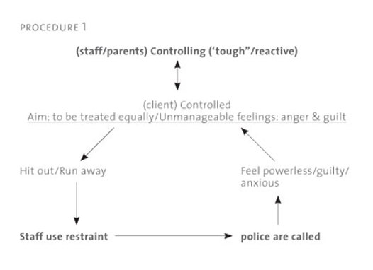 Through consultation and individual work a ‘controlling’ procedure could be described (Appendix 1, figure 1). It was revealed how staff were continuing to react to the client’s behaviour as previous staff groups had. In doing this an assumption could be derived which led them into these behaviours of: “either I’m fully in control or out of control”. This assumption worked equally well for both staff and the client. As a result a trap was identified where staff reacted to any instances of anger by being overly controlling. In response, the client’s anger escalated, with the negative consequences of being restrained or involvement from the police. This was understood to result in confirming to both the client and staff that he was dangerous and risky, and therefore required this level of control.