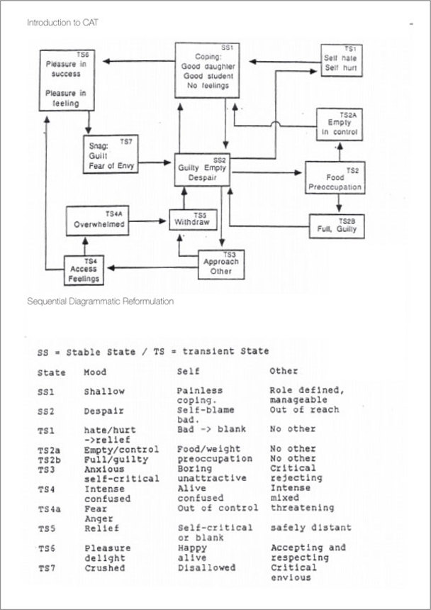 In 1986 when Ryle published a booklet entitled ‘An Introduction to Cognitive-Analytic Therapy’ the letter was seen as the key part of reformulation. In 1986 Ryle was writing that “in some instances, particularly in cases of personality disorder, the prose reformulation needs to be supplemented with a sequential diagrammatic reformulation or SDR.” (Ryle, 1986) (see Fig. 1).