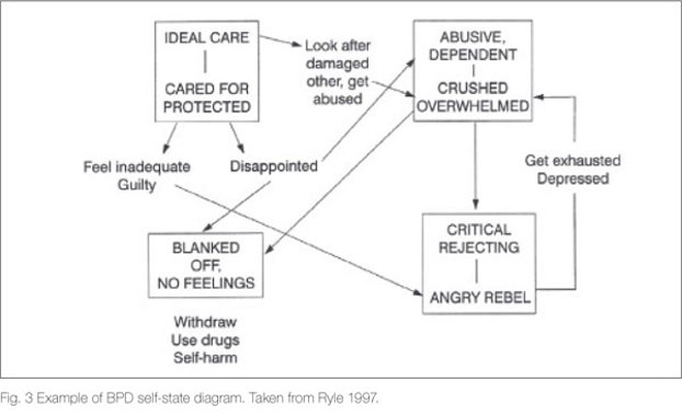 However, as early as 1979 Horowitz was talking about different states in those with Borderline Personality Disorder (BPD) (Horowitz 1979) and in 1990 Ryle published a paper discussing the use of the SDR to show in a clearer way the patient’s state shifts. I’ll just jump ahead a bit to show the development of the BPD diagram. In Ryle’s 1997 book on CAT and BPD (Ryle, 1997), the self-state diagram for BPD had clearly been chosen as the most helpful form for those with this disorder and for those caring for or treating them in a team setting. (see Fig. 3)
