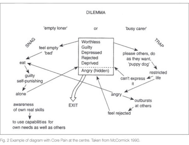 In Elizabeth McCormick’s book Change for the Better, originally published in 1990, she has a whole chapter on making a diagram for yourself of your inner conflict. All of these require us to identify our core state pain and place this at the centre of our diagrams. (see Fig. 2) (I have not found reference to core pain in Ryle’s work except when he talks about how unhelpful a term it is.)