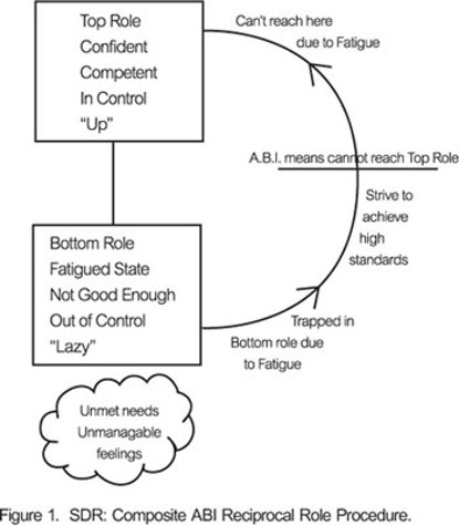 The Reciprocal Role Procedures (RRP’s) and ways of managing feelings which make recovery from mild and moderate ABI even more distressing than usual are those which involve striving and sustained action towards the desired Top Role. See Figure 1 for a composite Sequential Diagrammatic Reformulation (SDR) found with all the ABI clients. The presence of this kind of procedure may put a person at a greater risk of anxiety, depression, emotional distress and suffering, because due to brain injury fatigue the person no longer has the mental and physical stamina to enact the striving procedure. This leaves the person trapped in the Bottom Role, in the often unbearable position of being in touch with unmanageable feelings and unmet needs. In addition, they are unlikely to have a positive outcome from their brain injury rehabilitation. This evaluation found that the standard community brain injury rehabilitation intervention of advice and education regarding pacing activity to aid clients’ recovery from fatigue was not effective in these clients prior to them having CAT. Following CAT they were able to create exits from this procedure such as “feeling more and acting less” and were able to gradually increase activity and pace themselves appropriately.