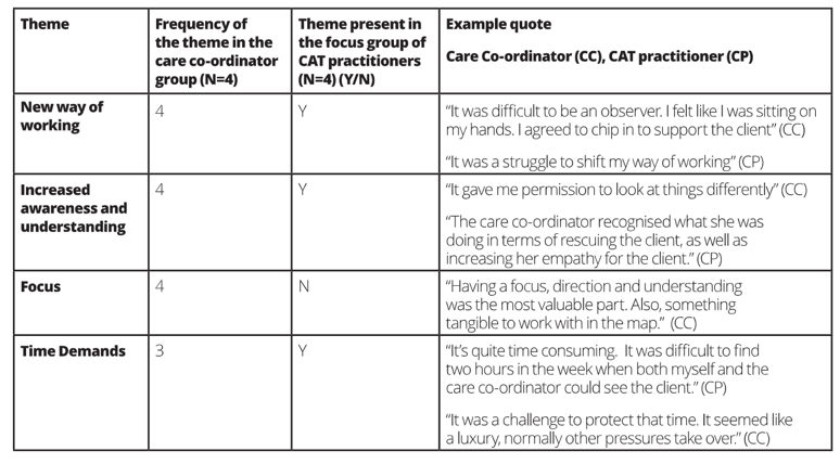 The interviews were found to contain four main themes: new way of working, increased awareness and understanding, focus and time demands. Table 1 contains the main themes, proportion of care co-ordinators endorsing the theme, whether the theme was present within the focus group discussion and example quotations from participants. (See Table Opposite)