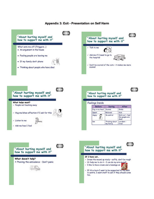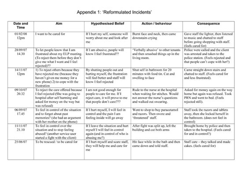 Appendix one contains an attempt to reformulate a functional analysis of a young woman with learning disability in CAT terms. The “reformulated incidents” (appendix 1) and contextual reformulation (appendix 2) were used in training with her staff team. Contextual reformulation may enable staff supporting people with a learning disability to understand the person, and their own reactions in a less distancing, more relational way. Ryle & Kerr (2004) highlight the potential role of CAT “as a consultative tool” for working with staff who support people with learning disabilities “both in residential and community settings to help them in avoiding collusion with clients’ maladaptive RRP’s” (see also Clayton, 2001). Sometimes it can be difficult to construct the boundaries around such work, but as Bancroft et. al. (2008) state, “If the client can performs some of the therapist’s ‘relating to the team duties’ such as when the client rather than the therapist tells the team about their diagram, the power belongs to the client within in their orbit”. Whilst this was not entirely possible in this instance, the young woman was able to deliver training around her exits by informing staff, in an accessible way about helpful and unhelpful responses to her self harm (appendix 3).