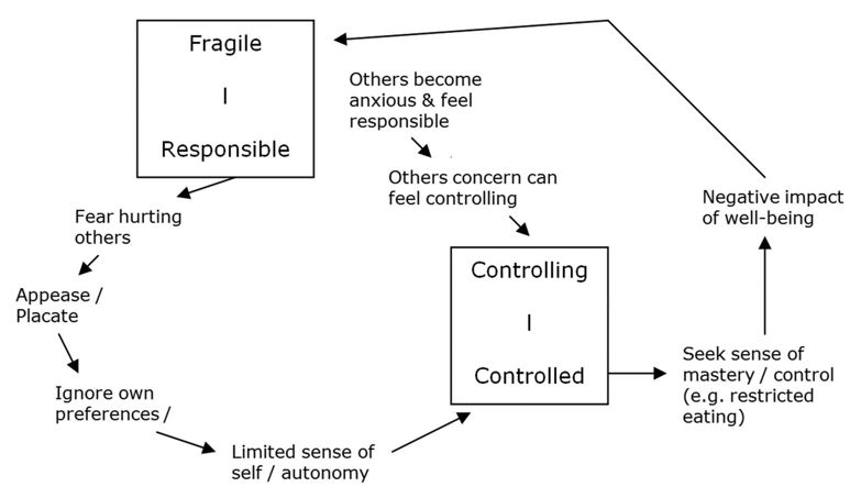 As the diagram highlights, the response of others to eating disordered behaviour can often feed into a procedural pattern, which further reduces a client’s sense of autonomy. This may lead to an increased need to seek autonomy via their eating disorder, or may also develop into an alternative pattern of rebellion with ‘If I must not, I will’ responses. Such patterns can also be useful in understanding the bingeing behaviour associated with purging anorexia and bulimia nervosa.