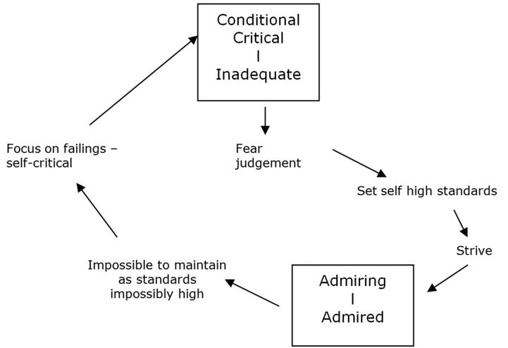 As a procedural pattern, perfectionism often seems to relate to a reciprocal role of conditional / critical care and a fear of being judged inadequate. The striving response reflected in a perfectionist pattern however embodies this reciprocation, as high standards are set and the individual is orientated towards noticing perceived failings as opposed to achievements. This in turn drives the cycle, as detailed in the following diagram.