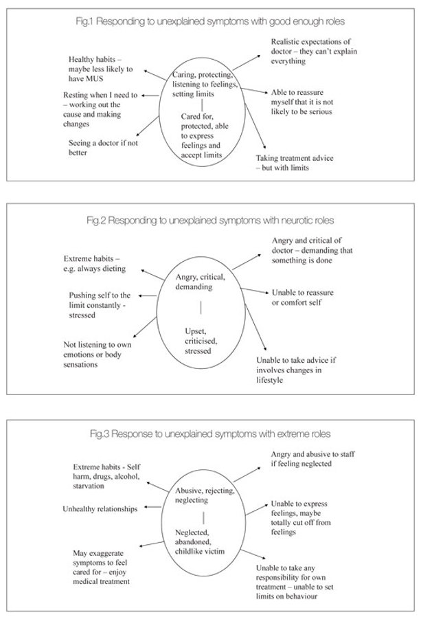 Around 25% of consultations in a GP practice are for symptoms that turn out to have no significant physical explanation, and this is even higher in hospital outpatient clinics. The term has become a bit trendy recently and is now being used to cover a very wide range of disorders, from syndromes that are thought to have a significant psychological component such as Irritable Bowel Syndrome and Chronic Fatigue Syndrome, to disorders of somatisation. Some of these appear more like old fashioned conversion disorder, where psychological conflicts are expressed through the body, and in some patients, there may be a suspicion that they are causing their own illness, for example by taking non-prescribed medication or by infecting wounds. Some of these patients attend very frequently and through their distress, or through direct demands, push doctors into doing more and more tests, some quite invasive. The tests can cause anxiety and have side effects themselves, thus generating even more symptoms. Some patients, who are convinced they are seriously ill, give up certain activities and become more and more dependent on their family or friends, leading to even more problems and further distress and anxiety. The recommended approach from doctors, when they see this pattern emerging, is to limit tests and referrals, offering a psychological explanation, and referral for psychotherapy in mild to moderate cases (Gill & Bass, 1997). A CAT contextual reformulation can help doctors to see the relationship roles that they are being pulled into – perhaps rescuer to rescued? This can make it easier to stand back and set limits around referrals or investigations.