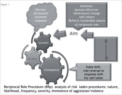 Reciprocal Role procedures (RRP’s) are the fundamental unit of analysis and level of inference in CAT (Ryle, 1992). Within RRPs we can gain a collaborative description of intentional acts or enactments of roles in relation to others. It is by looking at the Reciprocal Role repertoire that we can begin to identify the relational nature of the client’s risk of harming others (Pollock, 2006). A fine detailed analysis of each RRP and associated self-state has the potential to provide relevant information required for general and specific risk assessment (as recommended in the DOH guidelines.)