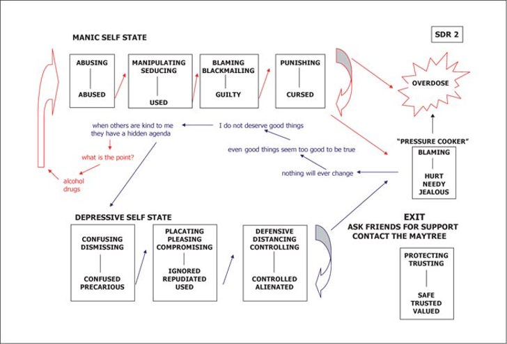 She recognized that she had started to spend longer periods of time at her partner’s following her unsuccessful attempts at resolving the issues with her accommodation. She came to realize that this had significantly affected their relationship and the way she saw herself within it. She felt increasingly powerless since she had taken on board the full responsibility/control of the practicalities of their lives. Her partner had responded to this by extending the time that he spent out with his friends abusing alcohol and drugs, and by disregarding her need for emotional and practical support during a very testing time of her life (Depressive Self State: Dismissing/Precarious -Pleasing/Repudiated – Distancing/Alienated) (See SDR 2).