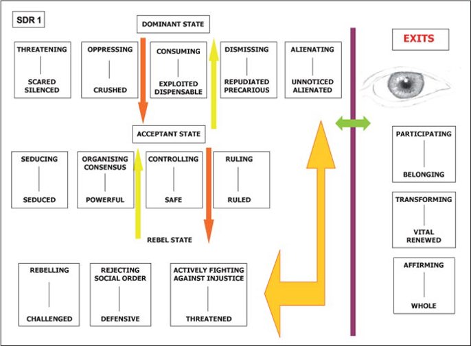 In order to prevent the risk of extreme dissociation, our constant shifts between the different Self States that I have defined as Dominant, Acceptant and Rebel must integrate through an active reflective perspective. I feel that we might be able to find Exits only by keeping a reflective eye wide open on our socially and historically constructed need to inhabit all different layers of meaning of those Self States and by continuing to be real individuals engaging in real activities through real roles. This might allow us to move between the dialectics of power, in which we are all more or less enmeshed, and the dialogic perspective to which we can aspire.