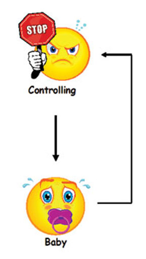 When Alex was familiar with the concepts in the reformulation booklet I brought to our session print outs of all the illustrative diagrams and pictures used in the reformulation booklet, two pairs of scissors, glue and a large sheet of paper with which to construct the SDR. Having explained what we were going to do I suggested we needed a starting point. Alex and I had just talked about difficulties with his parents on a recent home visit and he felt that ‘doing controlling’ was a very important issue. He cut out what had become the ‘controlling to baby’ role and stuck in on the paper. Over the next two sessions we continued to map out how feeling like a baby made him feel either sad or angry and the procedures that ensued.